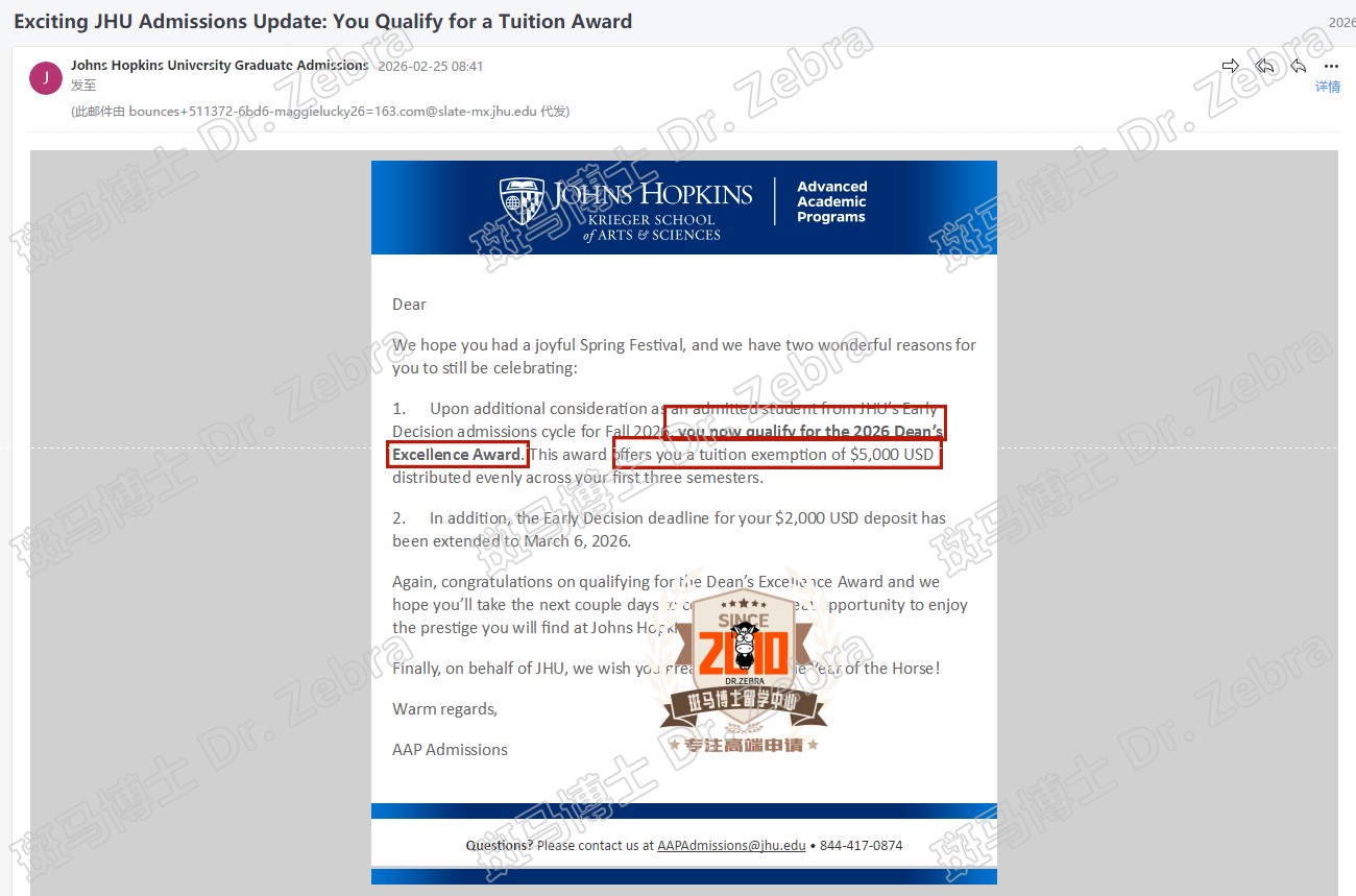 恭喜斑马博士客户获得Jhu MA in Communication硕士录取+5000美元奖学金!