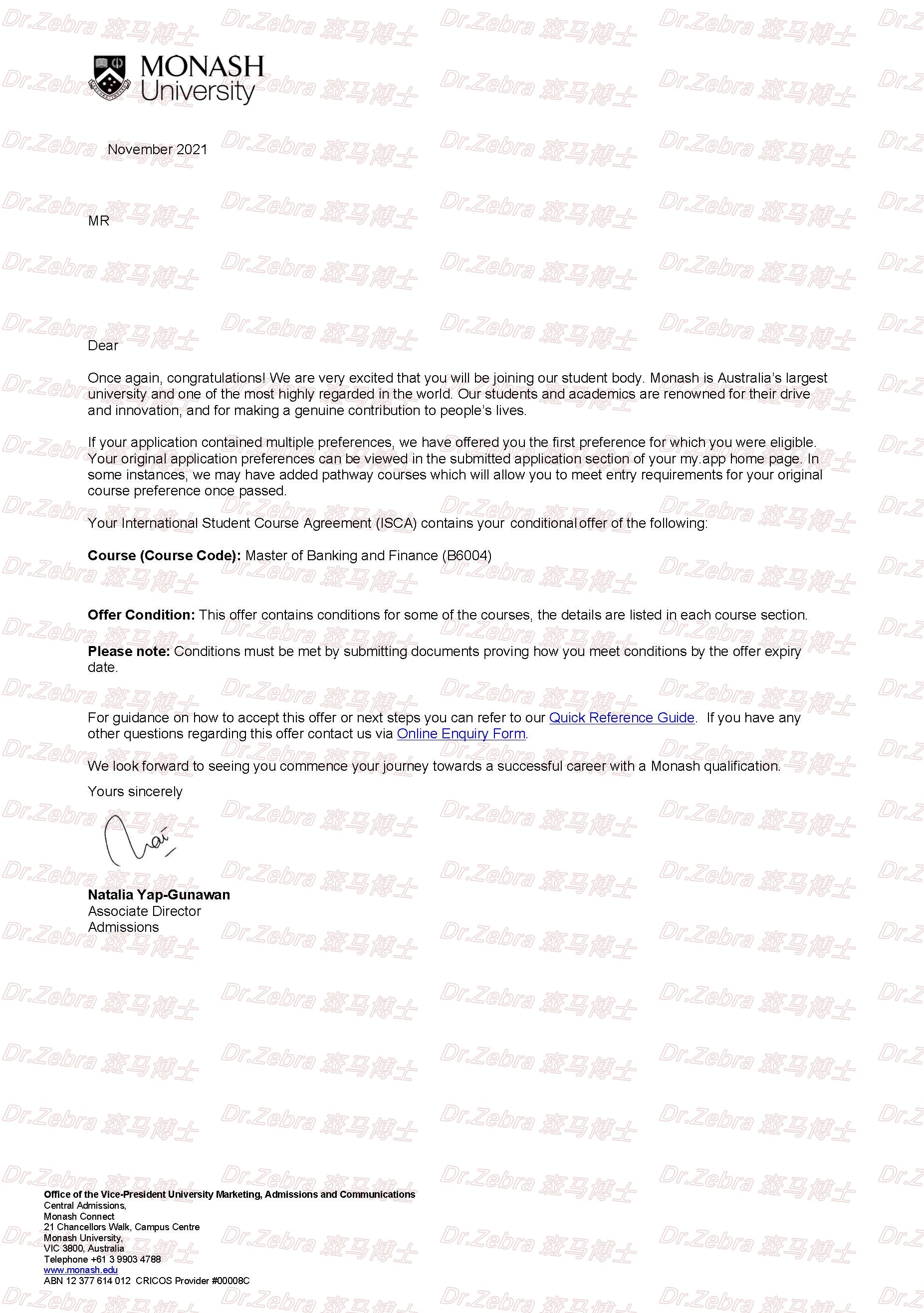 恭喜斑马博士客户斩获莫纳什大学Monash University Master of Banking and Finance 银行与金融硕士录取!