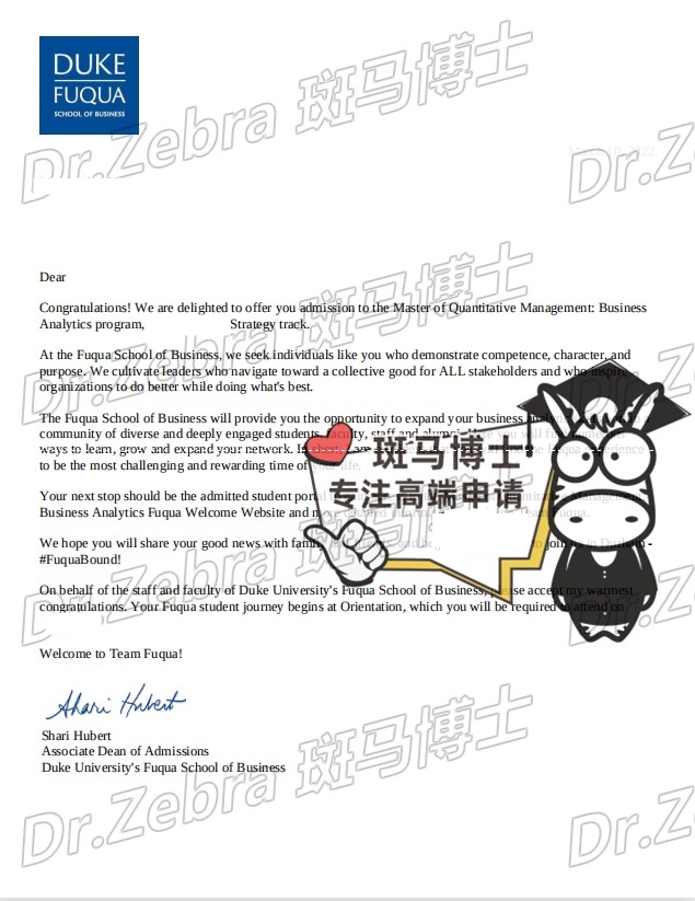 【斑马博士捷报】杜克大学 Duke University Master of Quantitative Management: Business Analytics Program Strategy Track录取!