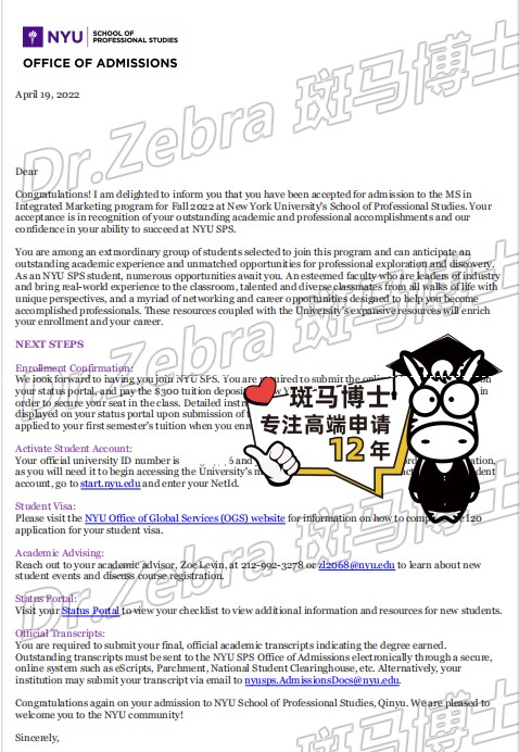 【斑马博士捷报】 纽约大学New York University(NYU)MS in Integrated Marketing 整合营销硕士录取!
