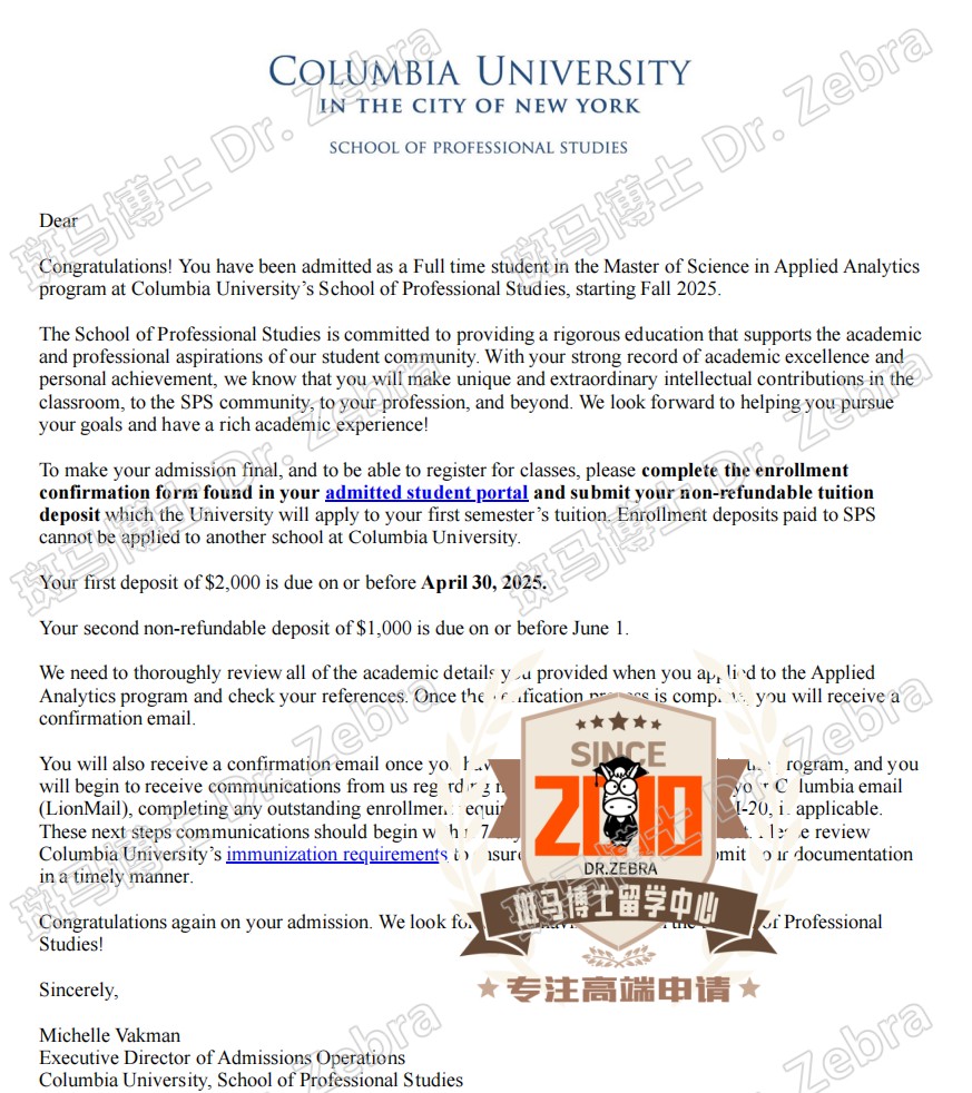 【斑马博士捷报】哥伦比亚大学Columbia University in the City of New York Master of Science in Applied Analytics(AA) 应用分析硕士录取!