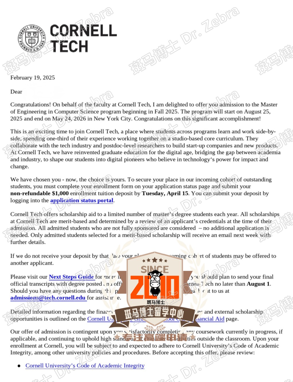 恭喜斑马博士客户获得康奈尔大学Cornell University Master of Engineering in Computer Science(MEngCS)硕士录取!